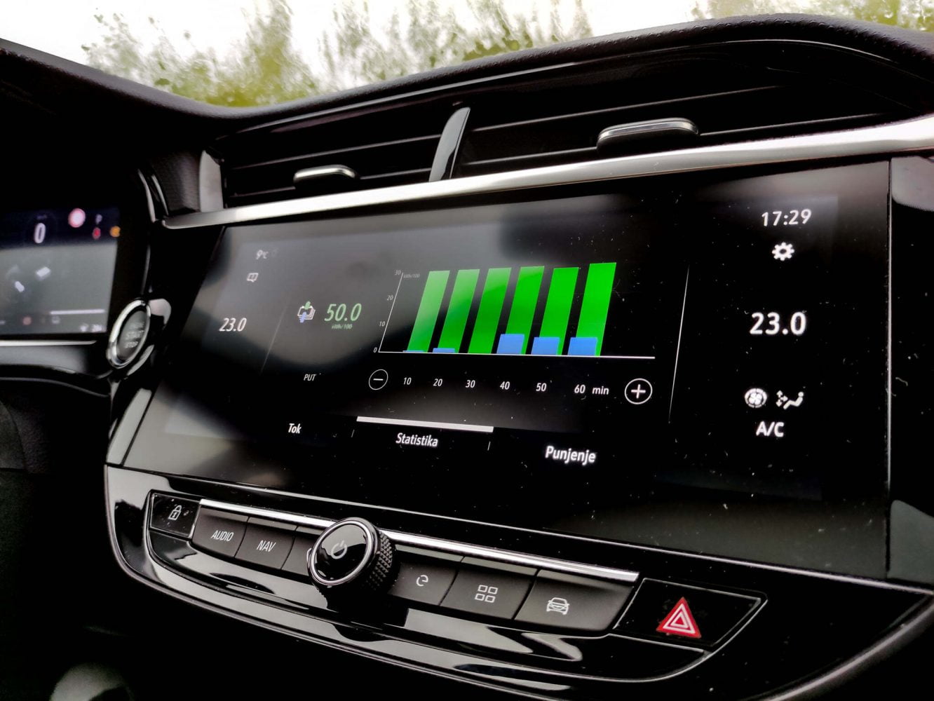 Šteta je da se ni u Corsi-e ne može vidjeti točan postotak napunjenosti nego samo procijenjeni doseg, ali Opel je barem stavio deset crtica koje pokazuju stanje baterije pa okvirno možete izračunati koliki je postotak napunjenosti preostao.